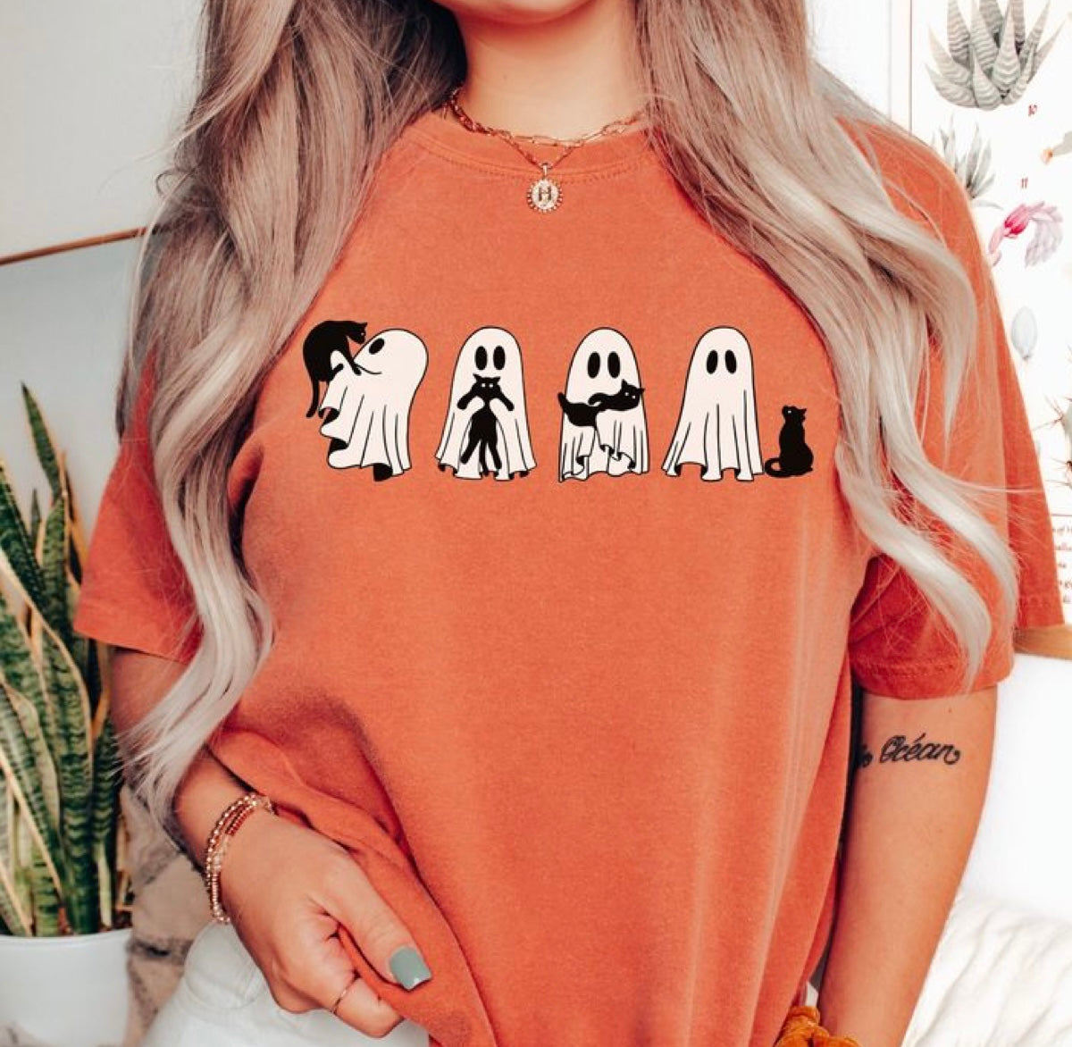 This adorable Halloween design features a little spooky ghost and his black cat. Perfect for the fall season, it will add a cute and festive touch to any outfit. Show off your love for Halloween with this charming design.