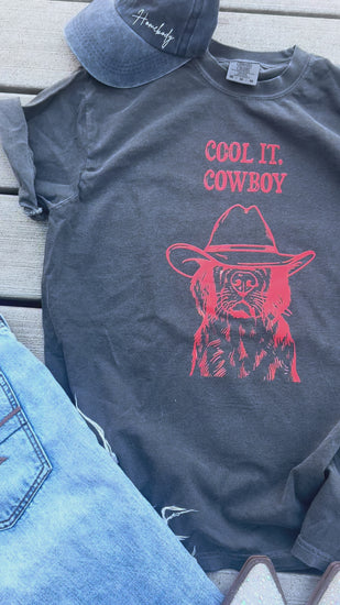 Saddle up in style with the "Cool It, Cowboy" t-shirt! This funky western tee is perfect for wrangling compliments and high-fiving your inner rodeo star. Whether you're kicking back at a hoedown or just chillin' at home, it's a real lasso of fun (without the horse!). Yeehaw!