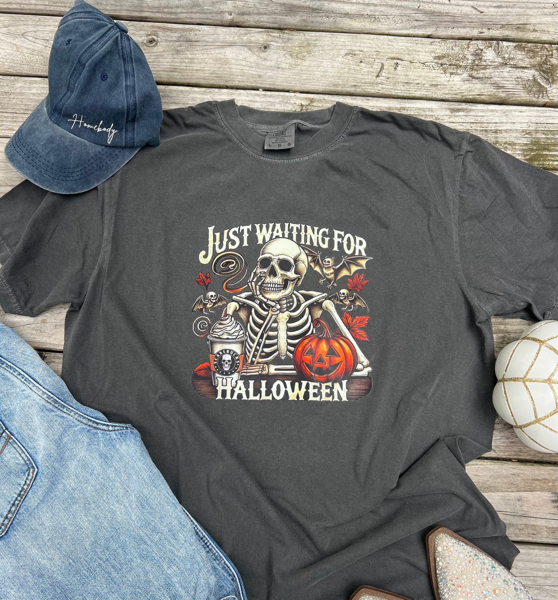 Get ready for Halloween in style with our Just Waiting for Halloween spooky skeleton shirt! This trendy grey shirt is perfect for the fall season and is sure to make a statement. Made of comfy fabric, this shirt will keep you looking and feeling great while you embrace the spooky season. Don't miss out on this must-have addition to your wardrobe!
